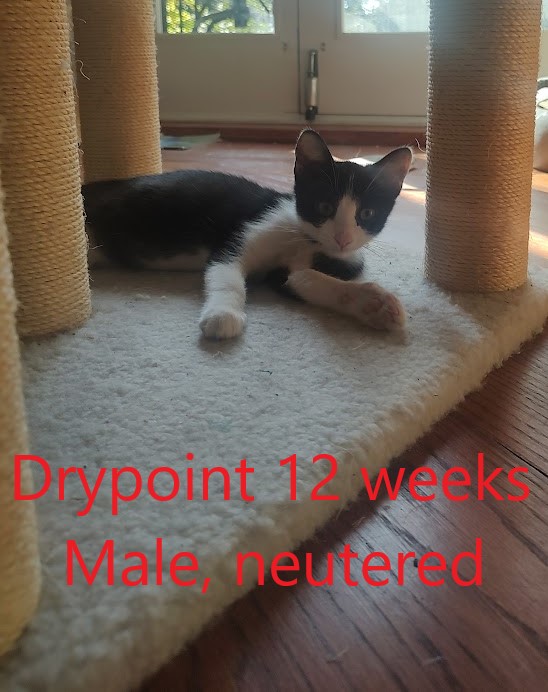 Drypoint is a playful little tuxedo boy with mischief in his eyes. He has as much energy to spare as he has cuddles to share.