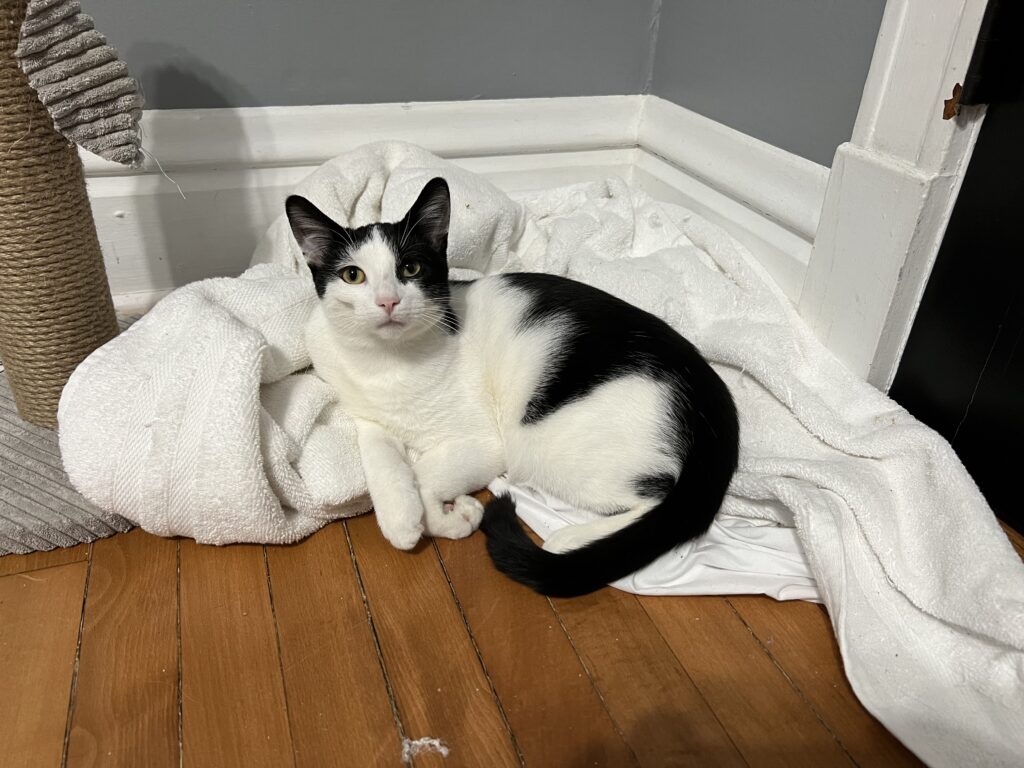 “Freddie is a younger black-and-white spotted boy, less than a year old. He was taken in as a kitten by a church, and immediately bonded with the elder cat Ollie who was already in residence, as a little shadow. He still has a lot of kitten energy, and will run around and play with toys with all that kitten energy. He loves sitting in his cat tree and surveying the outside world, but if he sees his buddy Ollie snuggle up to a human, he will come and snuggle up too, in order to get his share. Unlike Ollie (who loves everybody immediately), Freddie needs to build a little bit of trust first, but he’s getting braver as he grows into himself more.”
