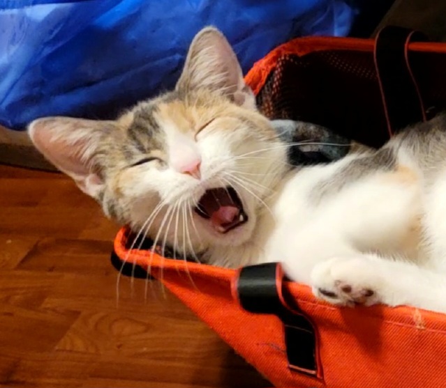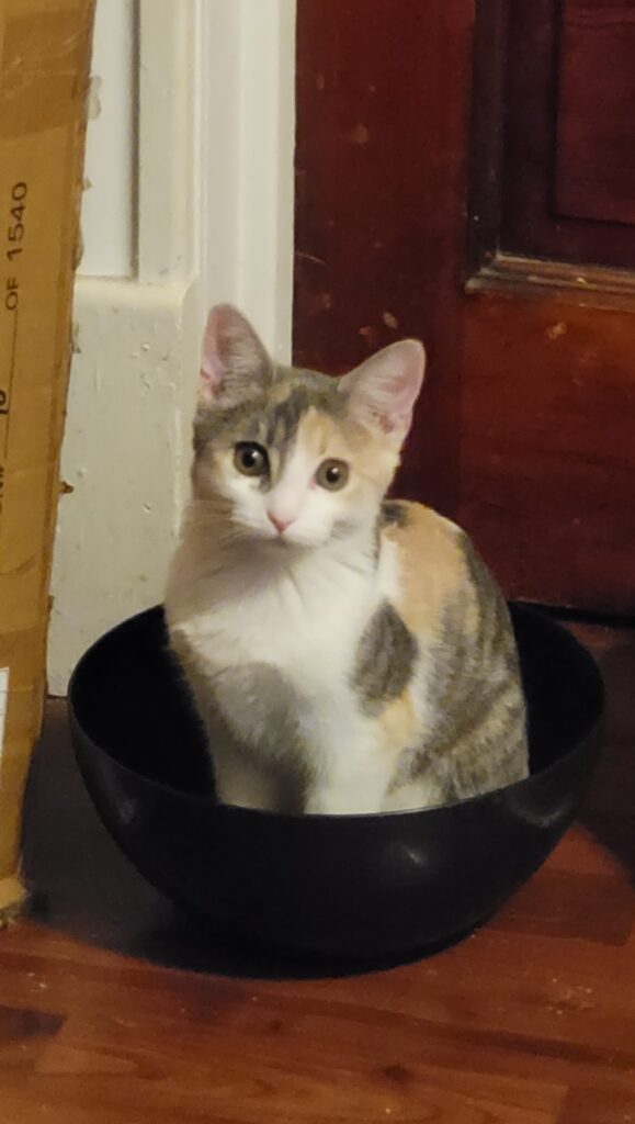 Adopting her does come with a catch. She’s been with us for a very long time. A shockingly long time, to be honest. She’s way too cute to be left behind this long! But she has been and now… we are terribly attached. I’m afraid that when you adopt her, you’re getting all of us. Not a joke! We’ll want pictures and news and to cat sit for free when you need it… We love her as much as you will.