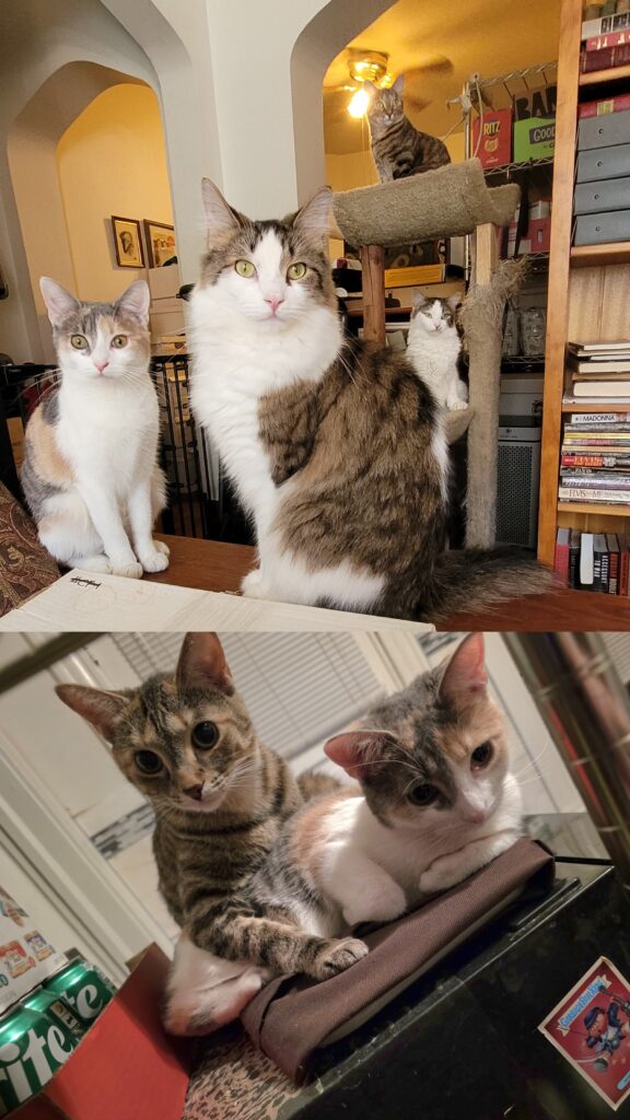 Top pic – Peep, her chosen dad, is an extraordinarily affectionate male Ragdoll-Siamese mix. He loves grooming (which is great cuz he’s a hairy, hairy dude!) and will spend all the time that Whisper’s grooming demands. He taught her all the best ways to find warmth and how to get busy people to drop everything to snuggle with you. She is now an expert at getting under the covers of her chosen human. Just TRY to say no!