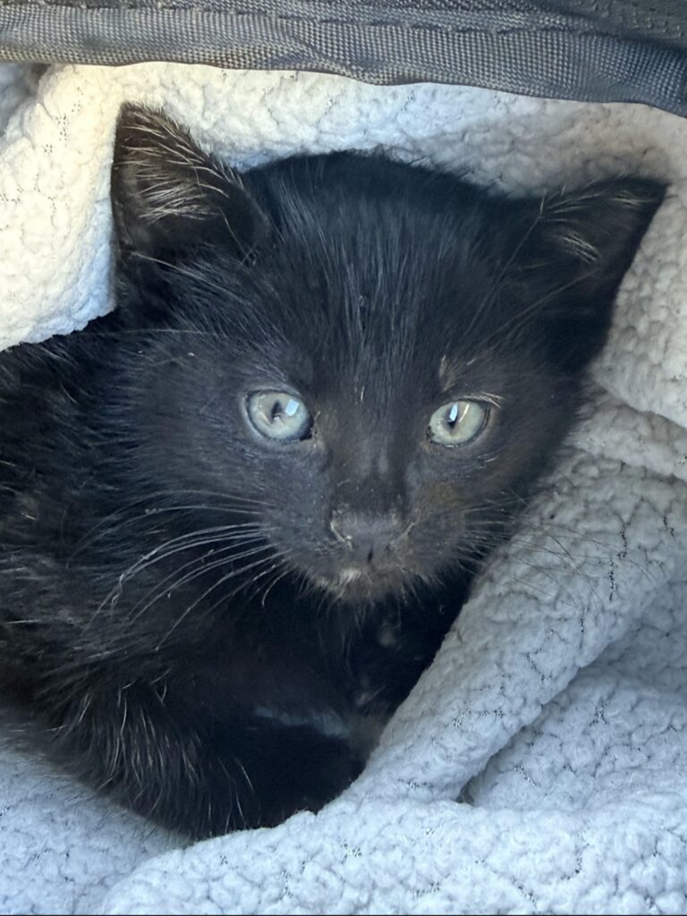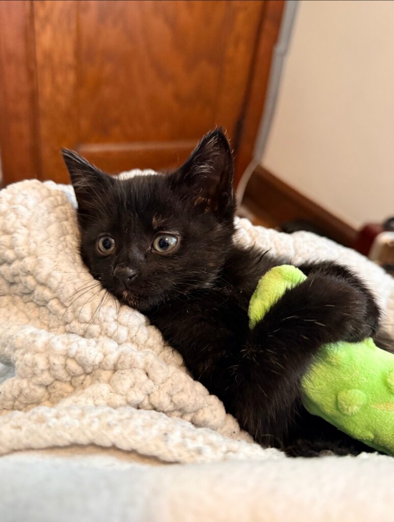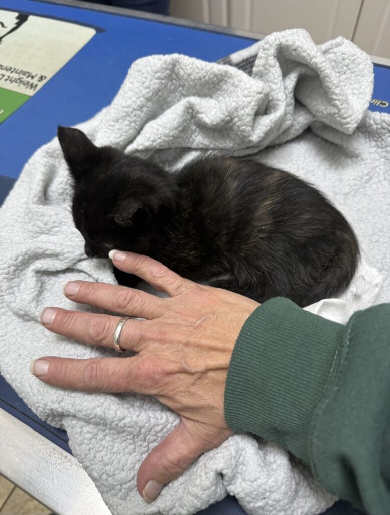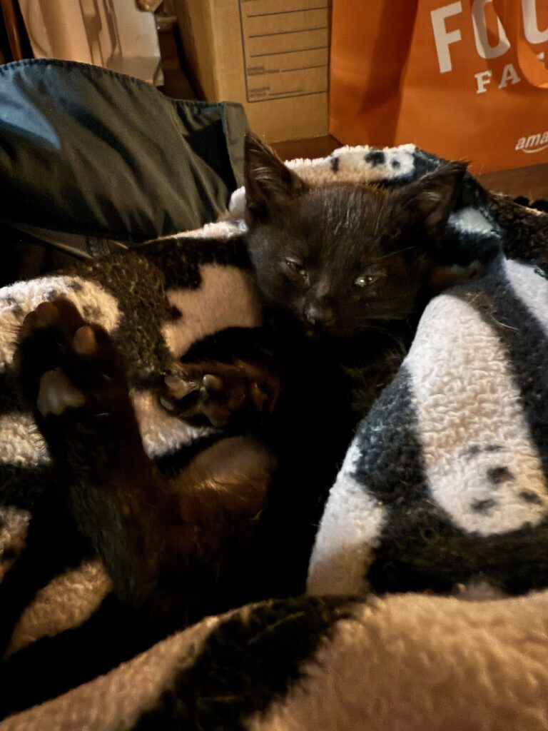 At this point, her gender was still unknown. She’s enjoying all the loving and warmth that she’s getting but a peek at her privates was just not to be had. What is known, at this time – Yogi is an absolutely BEAUTIFUL tiny black kitten!