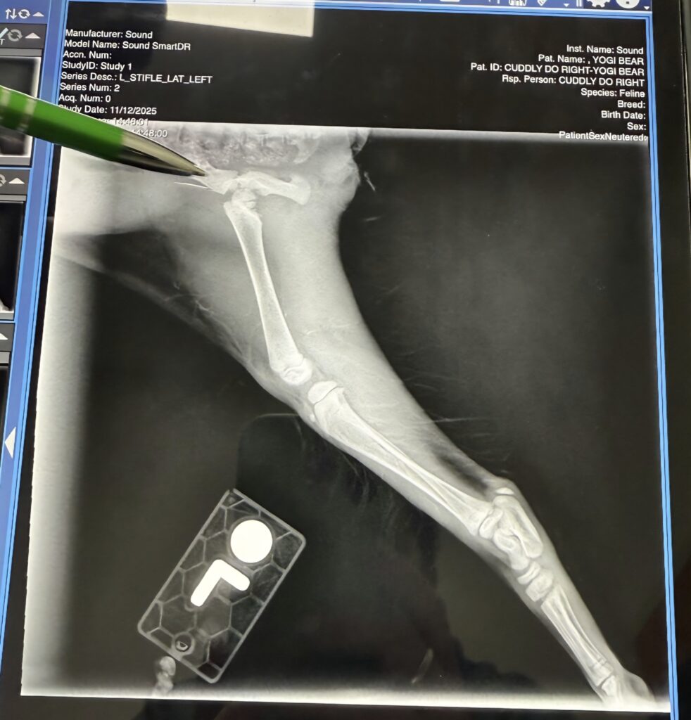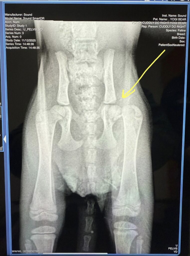 The question of what’s causing her to react in pain to having her left foot/leg touched and why she needs human assistance to support her tail end when she potties was answered, too. For the grand sum of $385, Yogi got her first poke and prod, a vaccination, some pyrantel… and a couple xrays. She has a fractured and dislocated femur. 😱